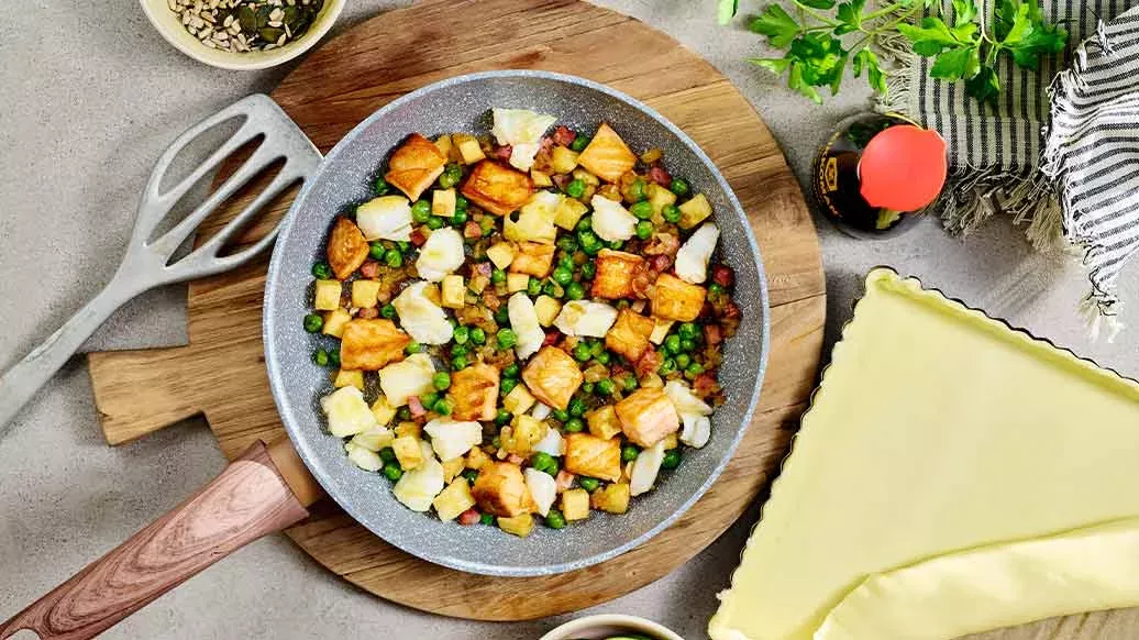160 g ciasta na quiche lub tartę – 1 łyżka oleju roślinnego – 100 g filetu z łososia – 100 g filetu z dorsza – 30 g boczku – 1 cebula – 50 g rozmrożonego groszku – 50 g pasternaku