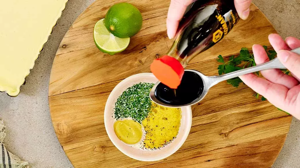 2 łyżki Naturalnie warzony sos sojowy Kikkoman – 30 ml śmietany – 1 łyżka musztardy – 1 łyżeczka soku z limonki – ½ łyżeczki świeżo zmielonego pieprzu – ½ łyżeczki curry w proszku – 2 łyżki świeżo posiekanej natki pietruszki