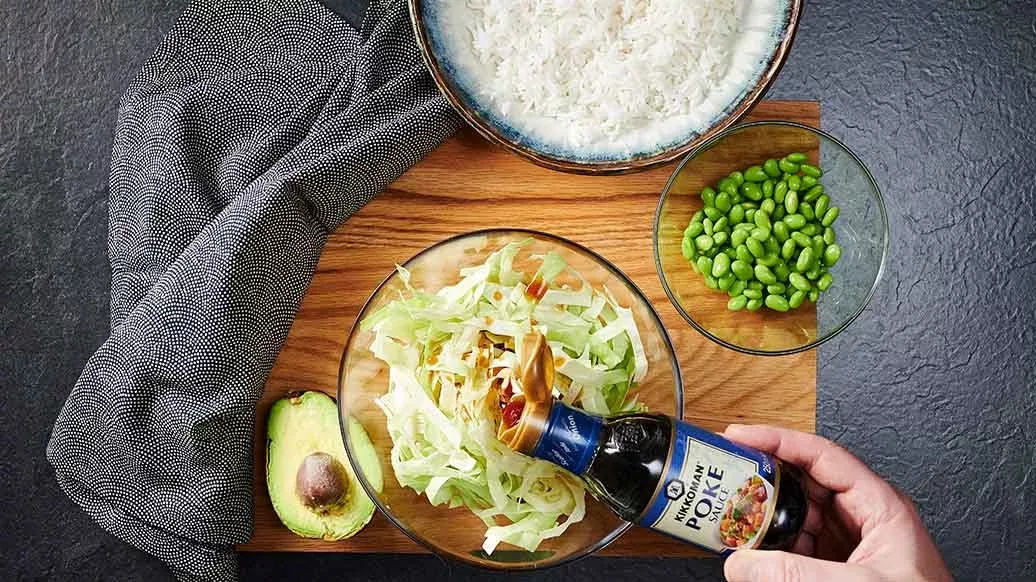 Ziarna edamame blanszować przez minutę. Kapustę pokroić w cienkie plasterki i wymieszać z sosem Poke Kikkoman. Awokado pokroić w plastry.
