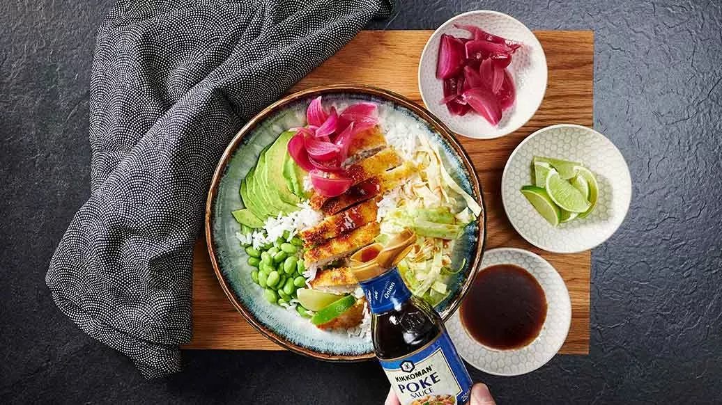 Kapustę, awokado, ziarna edamame, zamarynowaną cebulkę i kurczaka wyłożyć na ryż. Podawać w towarzystwie sosu Poke Kikkoman i pokrojonej w ósemki limonki.