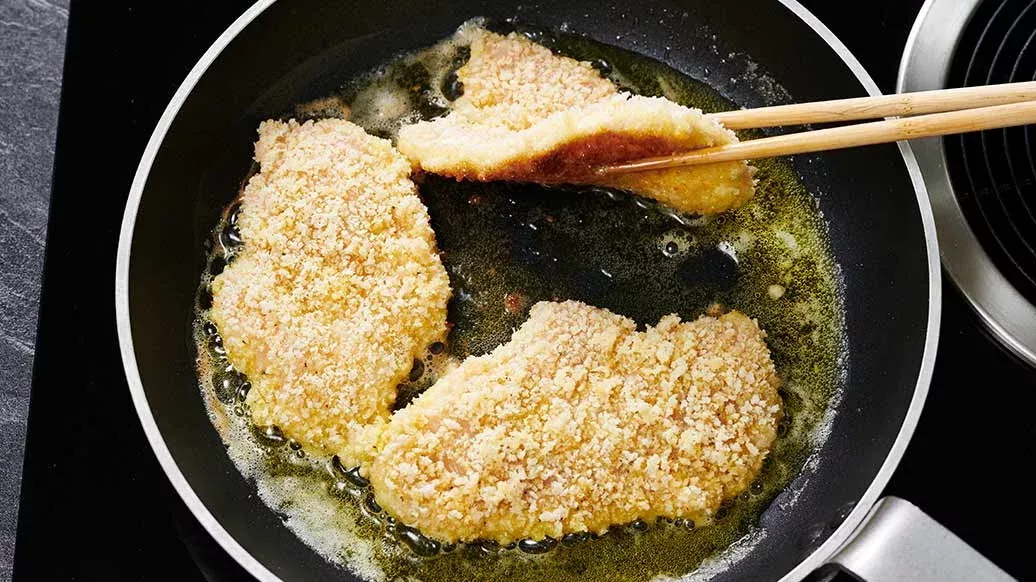 Rozbić filety z kurczaka do uzyskania równomiernych plastrów o grubości ok. 1 cm. Filety z kurczaka oprószyć z obu stron mąką oraz doprawić solą, pieprzem i curry. Filety obtoczyć w roztrzepanym jajku, a następnie w tartej bułce. Kurczaka smażyć w oleju po 5 minut z każdej strony. Wyłożyć mięso na papierowy ręcznik, aby usunąć nadmiar tłuszczu, a następnie pokroić w plastry.