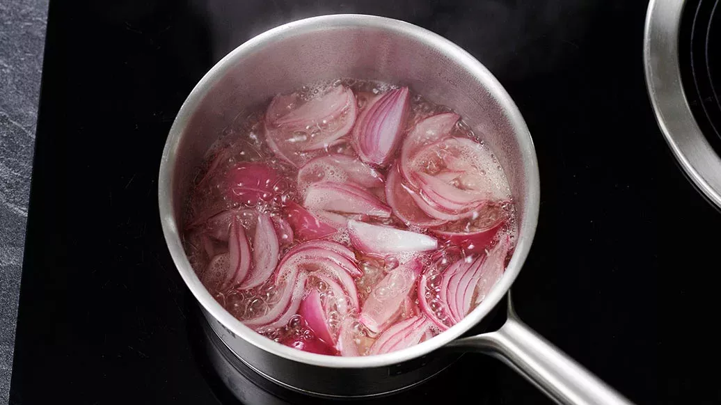 Cebulę pokroić w piórka. Zagotować wodę, ocet i cukier, dodać pokrojoną cebulę i gotować przez minutę. Zdjąć z ognia i pozostawić cebulę w gorącej wodzie jeszcze na co najmniej 15 minut.