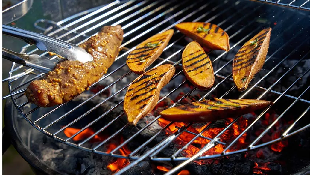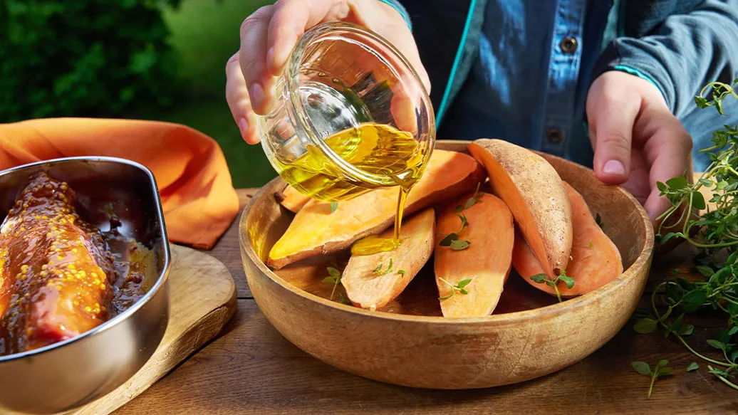 Bataty umyj i przekrój na pół. Skrop oliwą i dodaj tymianek. Grilluj na grillu lub patelni grillowej przez około 30 minut, aż bataty zmiękną.
