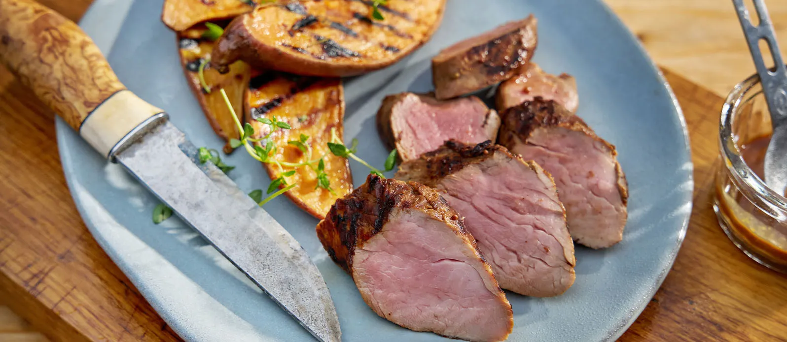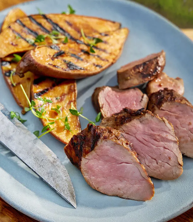 Marynowaną polędwicę grilluj z każdej strony przez około 12-15 minut na grillu lub patelni grillowej, aż będzie dobrze wysmażona. Przed pokrojeniem odstaw mięso na 3 minuty. Podawaj z pieczonymi batatami i resztą marynaty jako sosem.