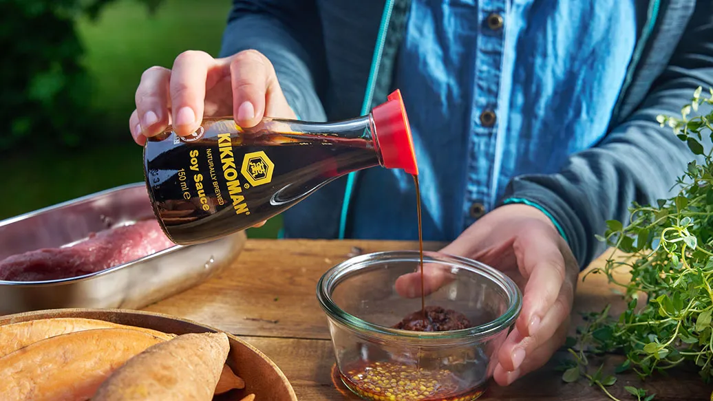 Soczysta polędwica wieprzowa marynowana w musztardzie, paście miso i Sosie sojowym Kikkoman, podawana z pieczonymi batatami i tymiankiem.