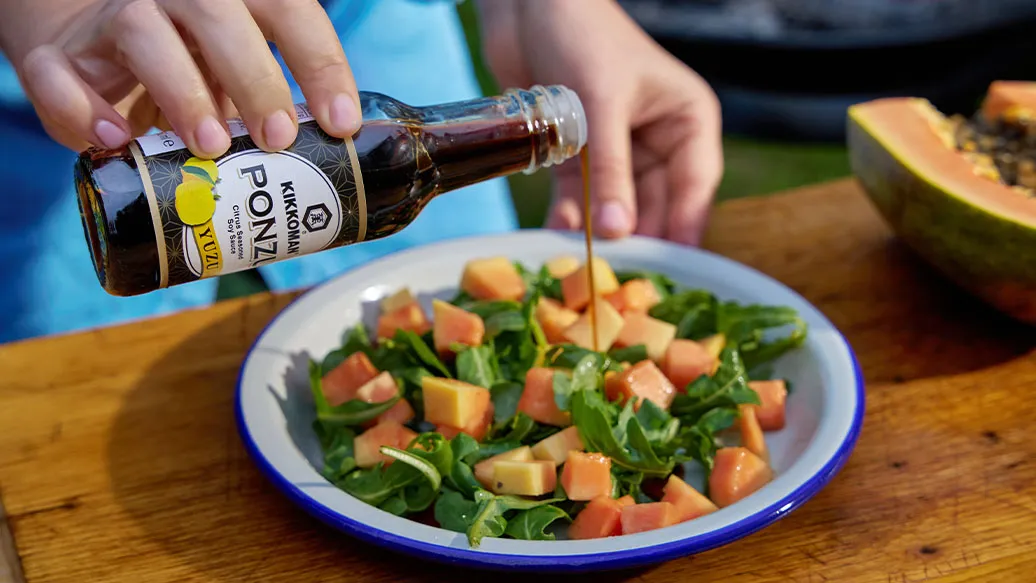 200 g papai – 60 g rukoli – 40 ml Kikkoman Ponzu - mieszanka sosu sojowego, octu i soku z owoców yuzu