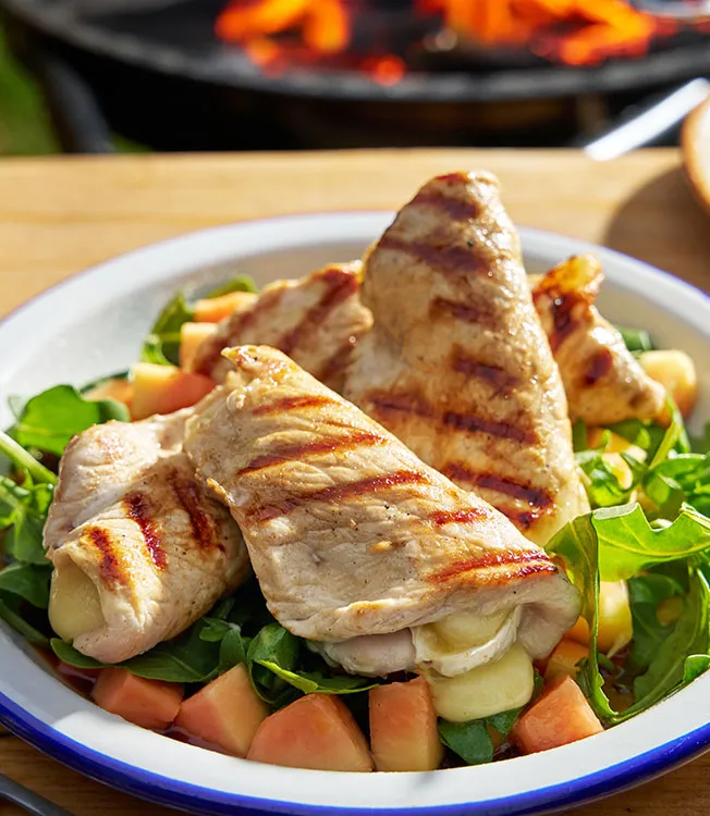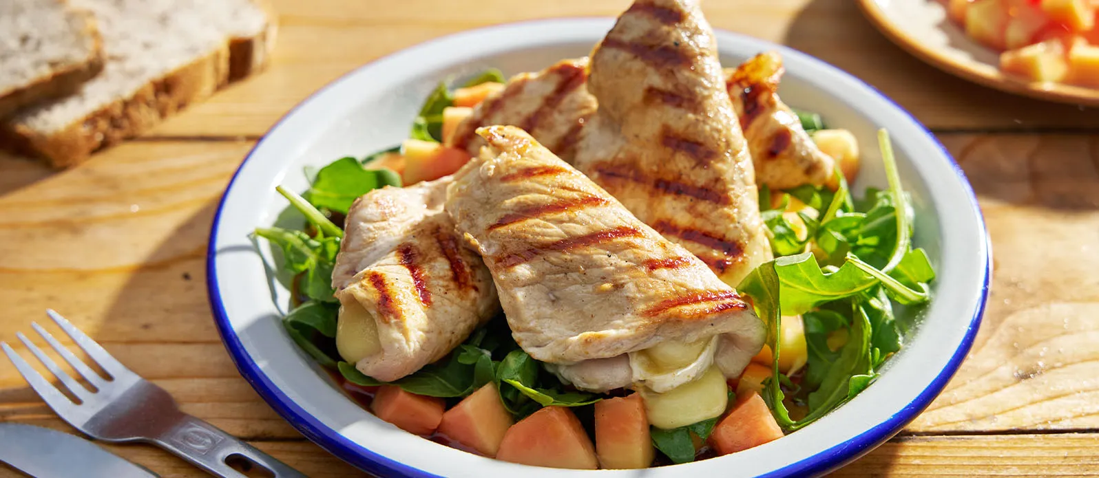 Soczyste kieszonki z polędwiczki wieprzowej z kremowym serem brie, podawane na sałatce z papai i rukoli skropionej Sosem Yuzu Ponzu Kikkoman.