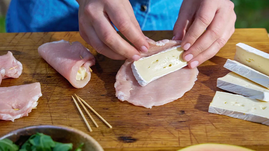 Rozbij plastry polędwiczki. Do środka nałóż trochę sera brie i złóż, tworząc kieszonkę. Zabezpiecz kształt wykałaczkami.