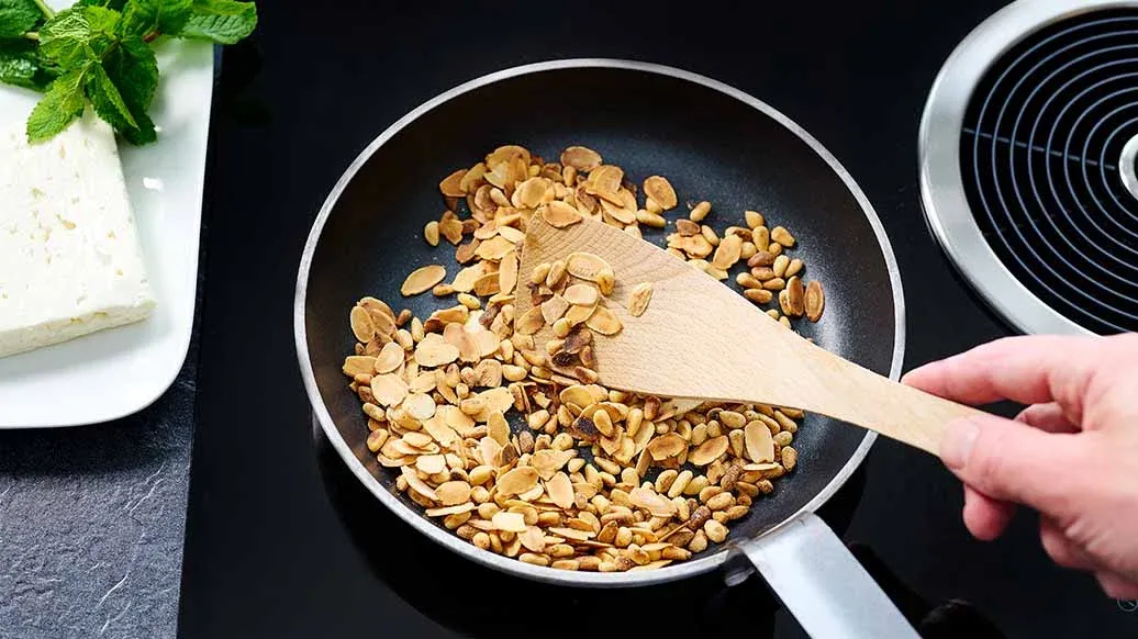 Praż płatki migdałów i orzeszki piniowe na małej patelni z nieprzywierającą powłoką przez około 3 minuty, aż się zezłocą. Pokrusz fetę.