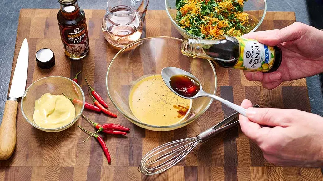 Przygotuj dressing. Chili drobno posiekaj i wymieszaj z Cytrusowym sosem Ponzu Kikkoman, Olejem sezamowym Kikkoman, octem, musztardą i syropem z agawy. Dopraw pieprzem. Wymieszaj dressing z jarmużem, brokułami i marchewką.