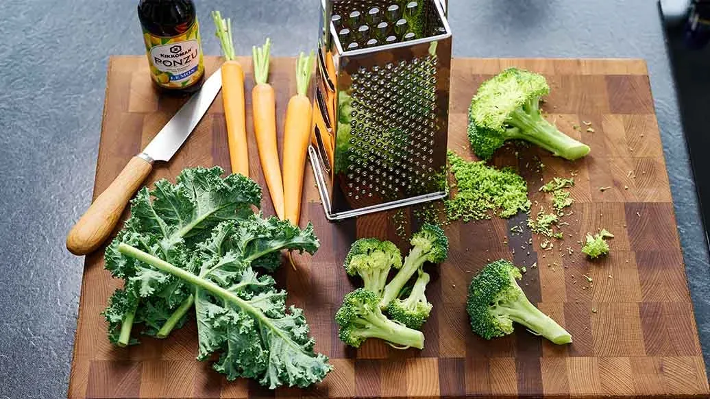 Jarmuż poszatkuj. Brokuły i marchewkę zetrzyj na tarce o drobnych oczkach.
