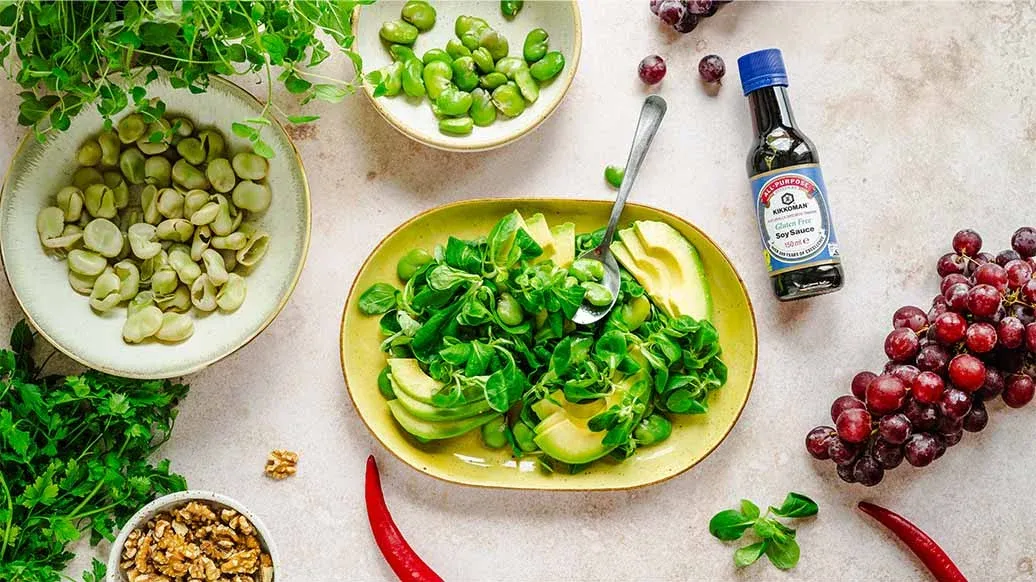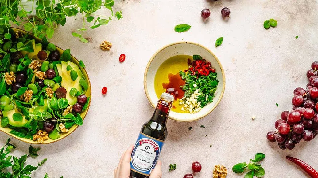 Drobno posiekaj czosnek, chili i zioła. Wymieszaj z oliwą, Bezglutenowym sosem sojowym Kikkoman i octem jabłkowym. Polej sałatkę sosem chimichurri.