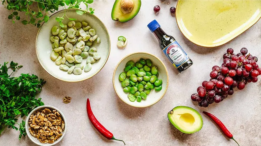 Pełna smaku sałatka idealna na lato, w której słodkie winogrona, kremowe awokado i delikatny bób łączą się z chrupiącymi orzechami włoskimi i wyrazistym sosem chimichurri. Sałatkę możesz serwować jako danie główne albo dodatek do lunchu czy dań z grilla.