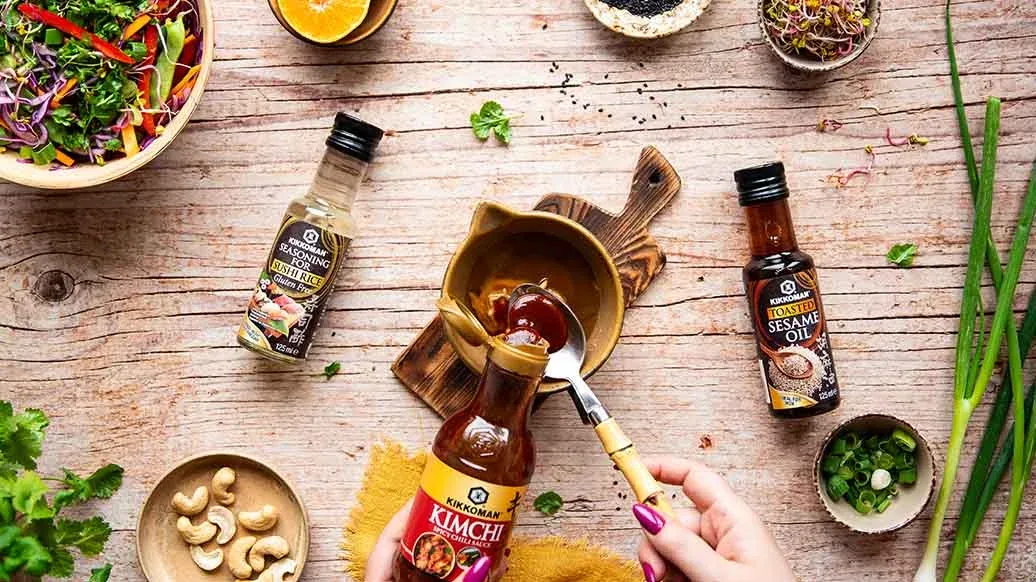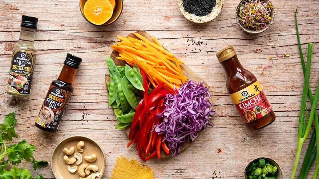 Kolorowa i wyrazista w smaku sałatka z czerwonej kapusty z warzywami podawana z nerkowcami, czarnym sezamem i świeżą kolendrą - a wszystko to w kremowym dressingu na bazie Sosu z chili do kimchi Kikkoman i oleju sezamowego.