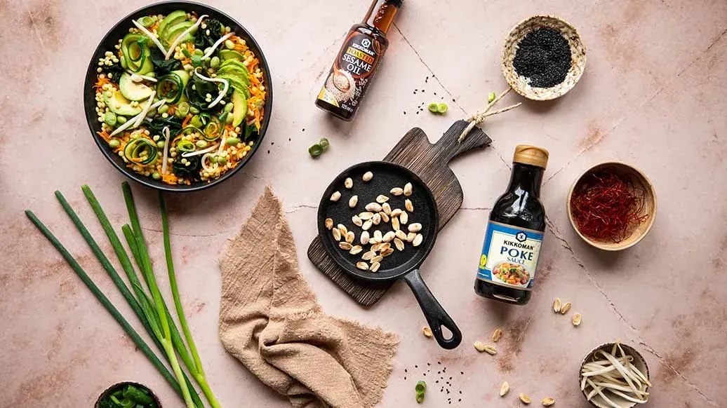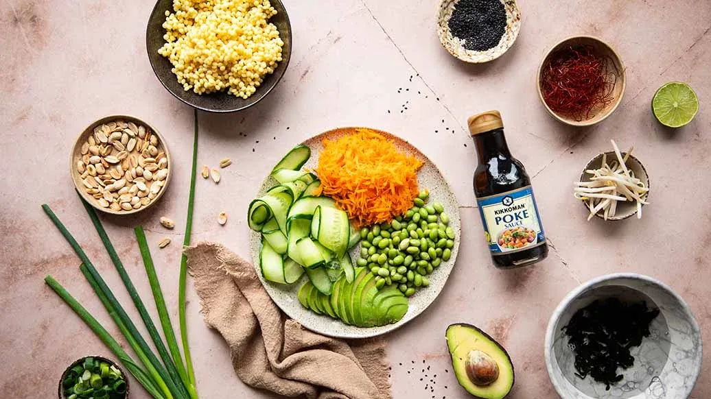 Soczyste warzywa, kremowe awokado, edamame i delikatne wodorosty wakame z kuskusem w lekkim sosie miodowo-limonkowym na bazie Sosu Poke Kikkoman. Orzeszki ziemne, kiełki i czarny sezam dodają tej orzeźwiającej sałatce wyrazistości i chrupkości.