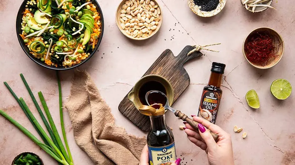 2 łyżki Sos Do Dań Poke Z Sosem Sojowym I Olejem Z Prażonych Ziaren Sezamu Kikkoman – ½ łyżki soku z limonki – 1 łyżka Olej z prażonych nasion sezamu Kikkoman – 1 łyżeczka miodu