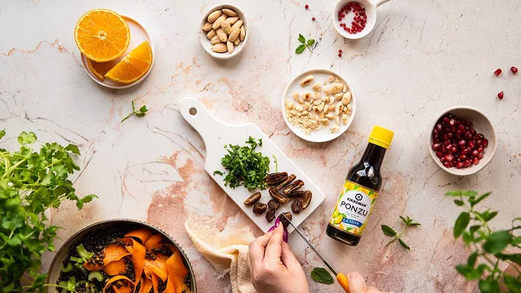 Inspirowana kuchnią marokańską sałatka z czarnej soczewicy z chrupiącymi warzywami, słodkimi daktylami i aromatycznymi ziołami jest zarazem lekka i sycąca. Jej smak dopełnia cytrusowy dressing na bazie Cytrusowego sosu Ponzu Kikkoman. Pełna białka, o bogatej konsystencji i smaku, ta sałatka to idealna przystawka lub dodatek do głównego dania.
