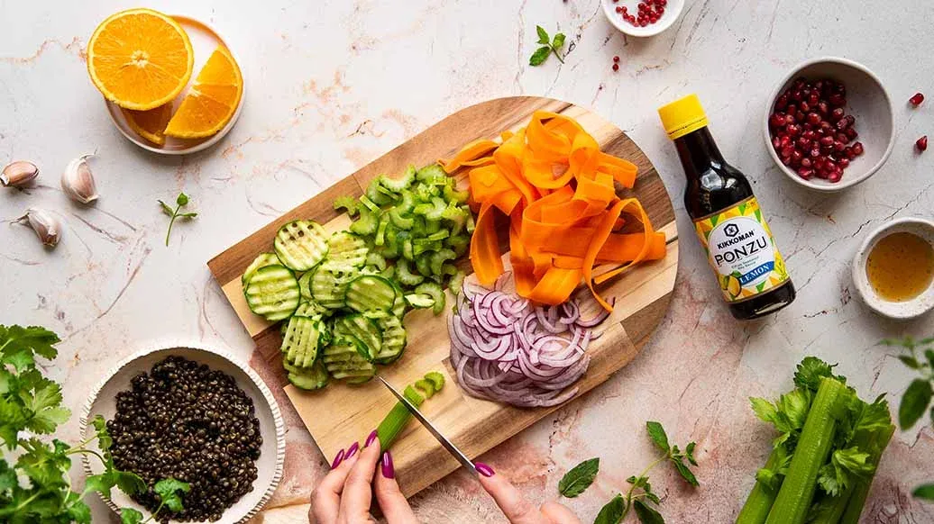 Marchewkę obierz i pokrój w paski. Ogórka i selera pokrój na plasterki, a cebulę w cienkie piórka. Warzywa wymieszaj z soczewicą. W osobnej misce przygotuj dressing: wymieszaj oliwę z Cytrusowym sosem Ponzu Kikkoman, sokiem z pomarańczy i skórką pomarańczową, syropem klonowym, czosnkiem, cynamonem, kminem i czerwoną papryką.