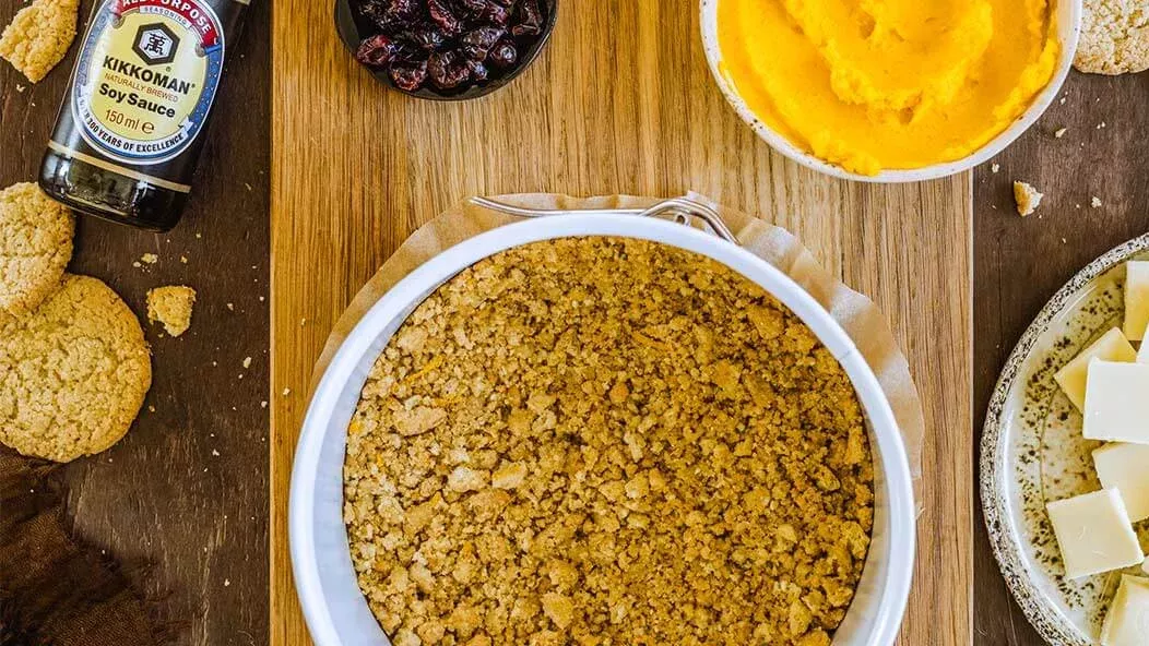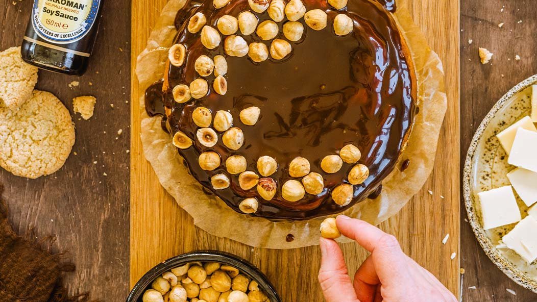 Puszysty sernik dyniowy na spodzie z pełnoziarnistych ciasteczek świetnie komponuje się z karmelem. Jego delikatna słona nuta została uzyskana dzięki dodaniu magicznego składnika, jakim jest sos sojowy. Chrupiące orzechy laskowe dodają więcej intensywnego smaku i ciekawej faktury.