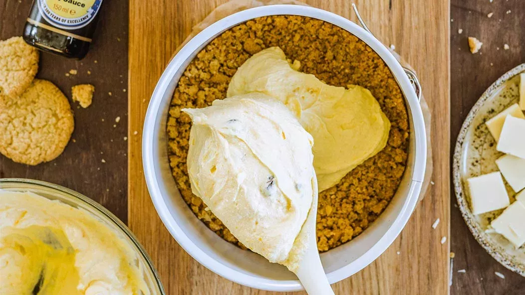 Piekarnik nagrzej do 180 stopni. Pokruszone ciasteczka wymieszaj z roztopionym masłem i skórką z pomarańczy. Mieszankę wyłóż do formy wyłożonej papierem do pieczenia. Piecz 10 minut, po czym odstaw do wystudzenia.