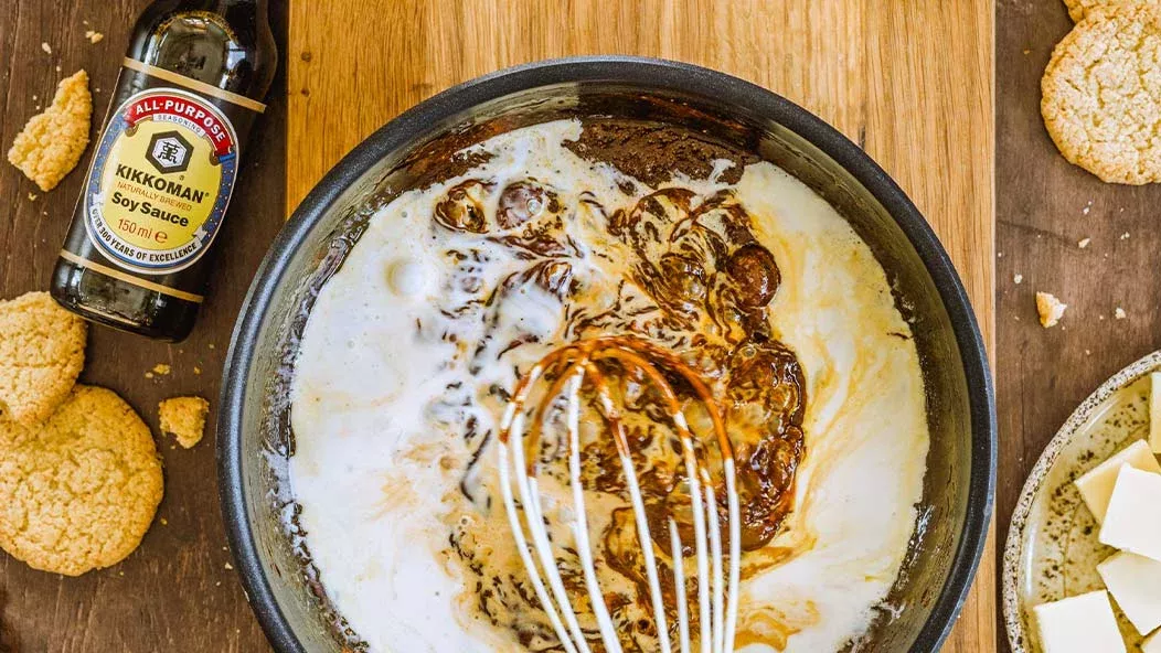 100 g cukru trzcinowego – 1 łyżka masła – 200 g śmietanki 30% – 1 łyżka Naturalnie warzony sos sojowy Kikkoman