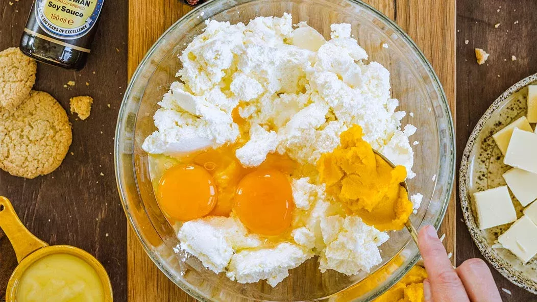 Czekoladę roztop w kąpieli wodnej wraz z masłem. Odstaw do przestudzenia. Twaróg zmiksuj z jajkami i puree z dyni.