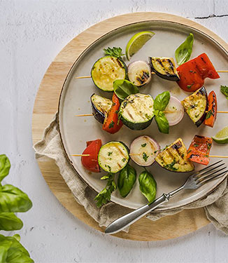 Klasyka każdego grilla, czyli szaszłyki. W wersji warzywnej przygotowane z cukinii, papryki, bakłażana I dymki, która po ugrillowaniu staje się pełnym słodyczy przysmakiem.