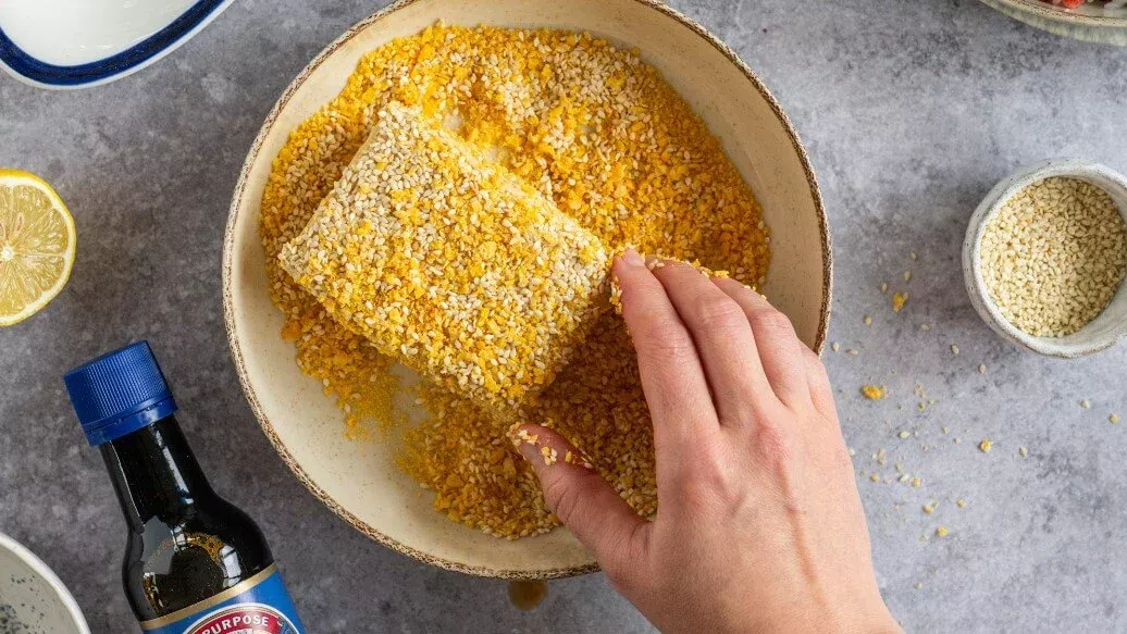 Tofu namocz w sosie sojowym zmieszanym z mlekiem i skrobią ziemniaczaną. Następnie obtocz tofu w sezamie oraz pokruszonych płatkach kukurydzianych. Smaż na oliwie na złoty kolor.