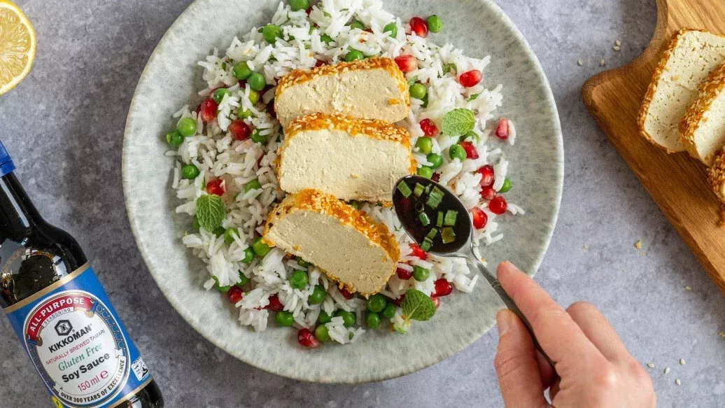 Główną atrakcją tego dania jest tofu w chrupiącej panierce w duecie ze słodko-słonym sosem ze szczypiorkiem. Świetnie smakuje podane z ryżem, któremu charakteru dodaje zielony groszek i słodkie pestki granatu.