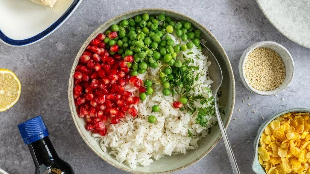 Ryż przepłucz, zalej podwójną ilością wody i gotuj przez 10 minut. Groszek gotuj do miękkości. Wymieszaj groszek z ryżem, posiekaną miętą, skórką oraz sokiem z cytryny, pieprzem i pestkami granatu.