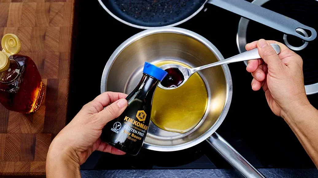 Wymieszaj syrop klonowy z Bezglutenowym sosem sojowym Kikkoman. Podgrzej delikatnie w razie potrzeby.