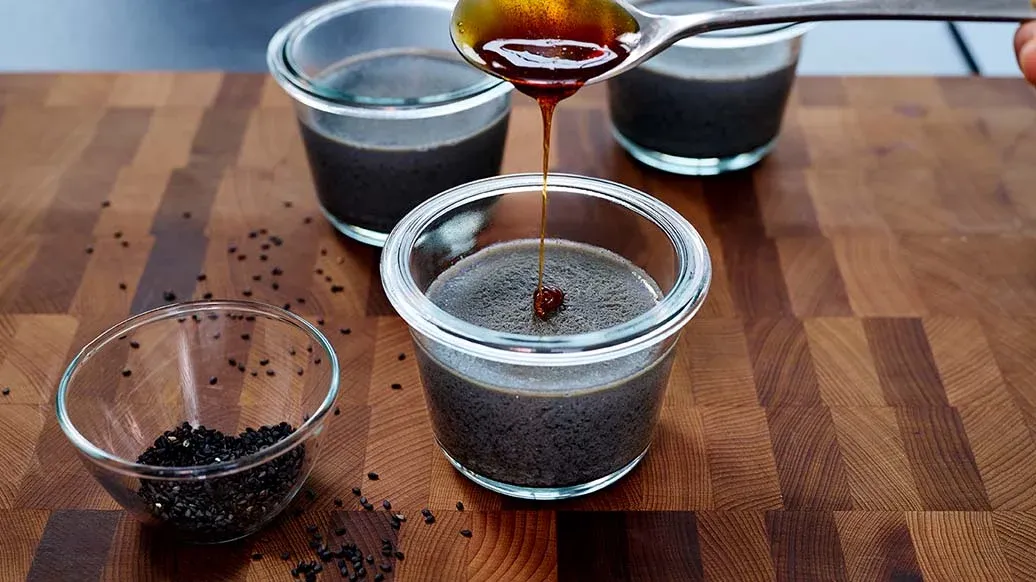 Kremowa, słodka i orzeźwiająca, ta wegańska panna cotta zawdzięcza swój wyrazisty kolor czarnej paście tahini. Połączenie kremowego mleka sojowego z wanilią i syropem doprawionym Bezglutenowym sosem sojowym Kikkoman tworzy subtelną głębię umami, która czyni ten deser naprawdę wyjątkowym.