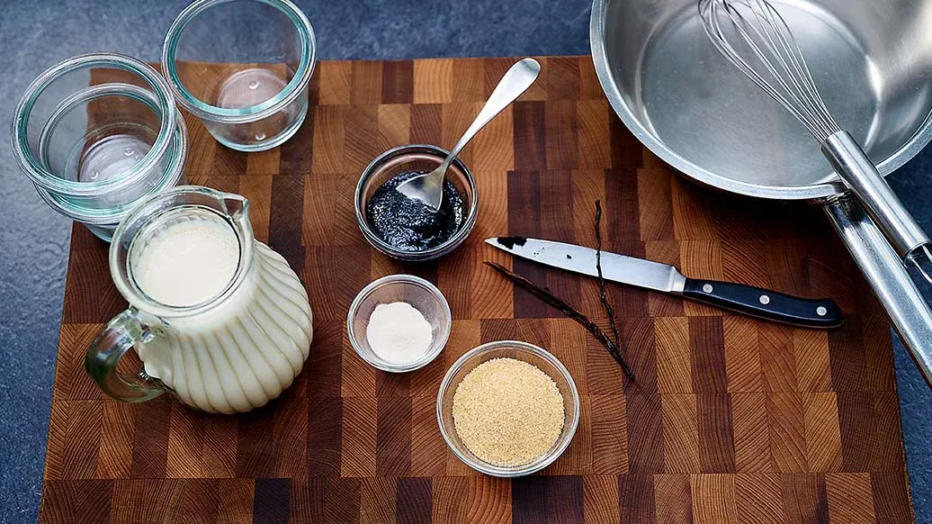 1 laska wanilii – 600 ml mleka sojowego – 50 g brązowego cukru (lub 4 łyżki syropu klonowego) – 2 łyżki czarnej tahini (ze słoika) – 1 ½ łyżeczka agaru (zobacz: wskazówka)