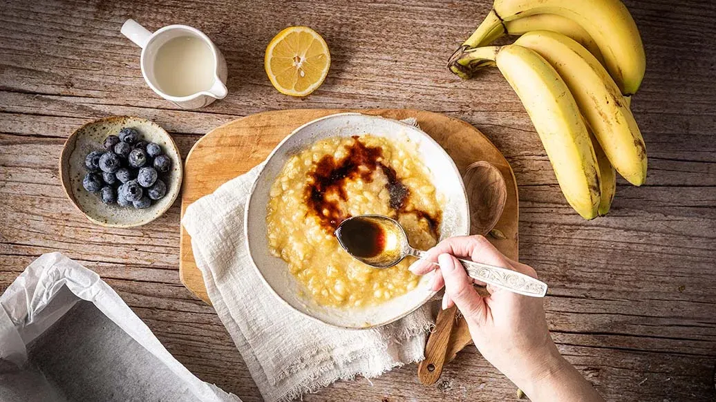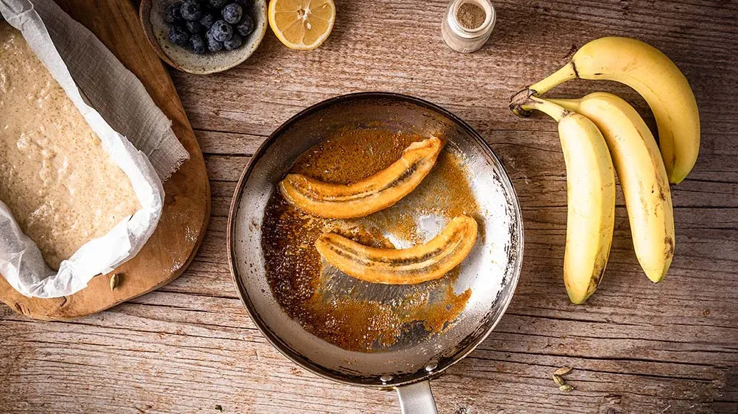 Na patelni rozgrzej olej kokosowy. Dodaj syrop klonowy i Sos sojowy Kikkoman o obniżonej zawartości soli. Umieść na patelni przekrojonego na pół banana i karmelizuj go przez 1 minutę z każdej strony.