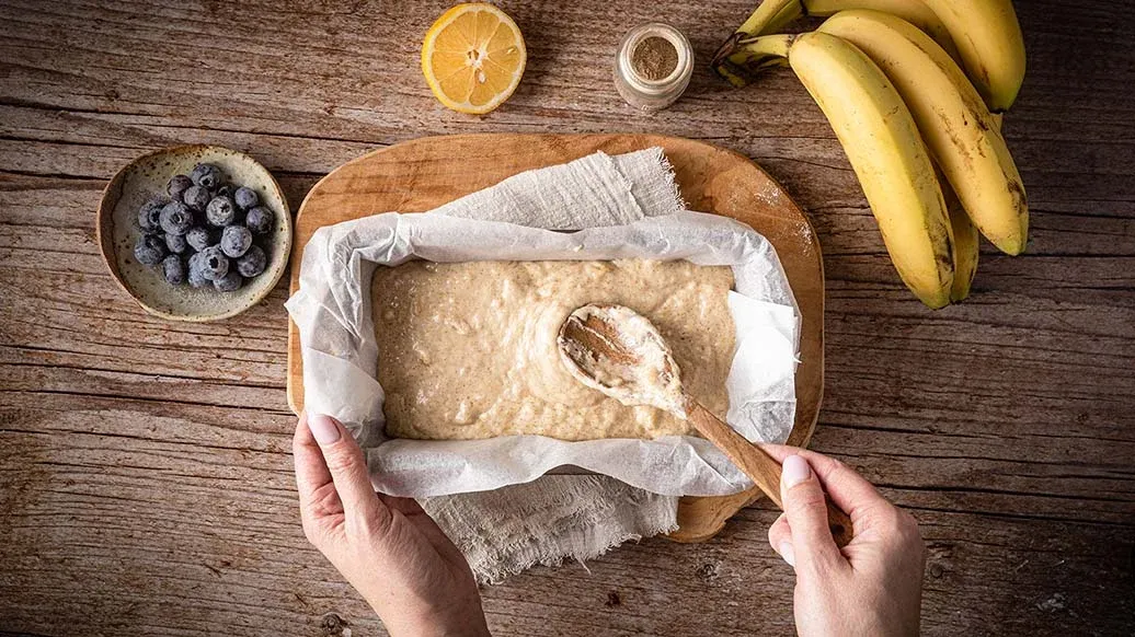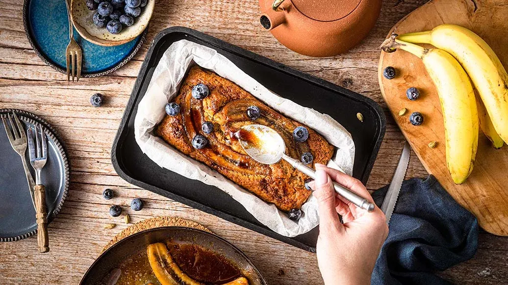 Wilgotny, aromatyczny chlebek bananowy z kardamonem. Sos sojowy Kikkoman o obniżonej zawartości soli podkreśla słodycz bananów i glazury z syropu klonowego, jednocześnie dodając głębi i subtelnego posmaku umami.