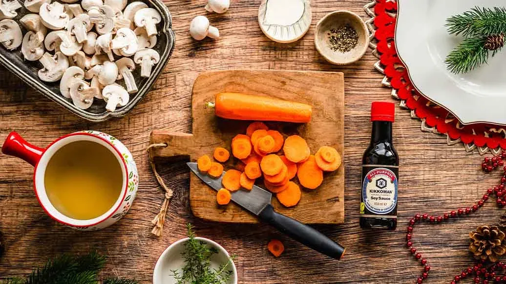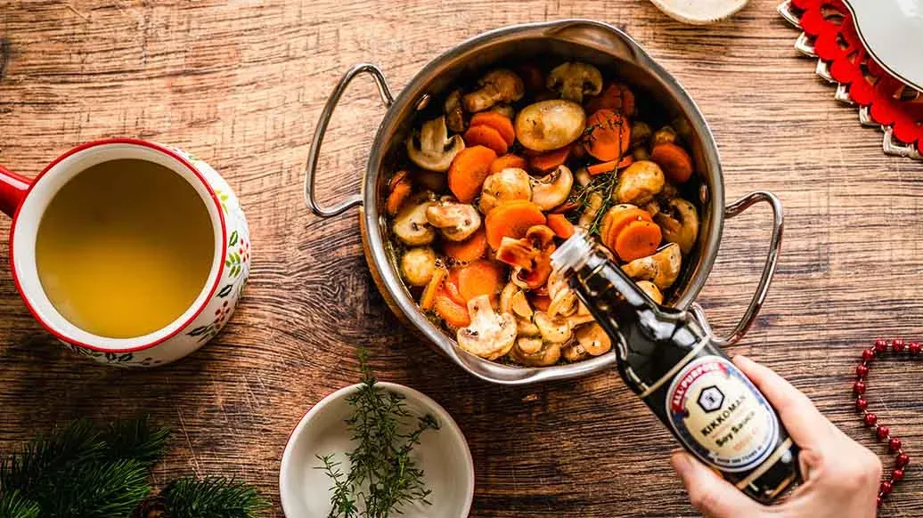 Bogaty, aromatyczny gulasz z grzybów i marchewki, delikatnie duszony w ciemnym piwie z dodatkiem Sosu sojowego Kikkoman i zwieńczony śmietaną. To sycące wegetariańskie danie idealnie nadaje się na świąteczny posiłek z pieczonymi ziemniakami.