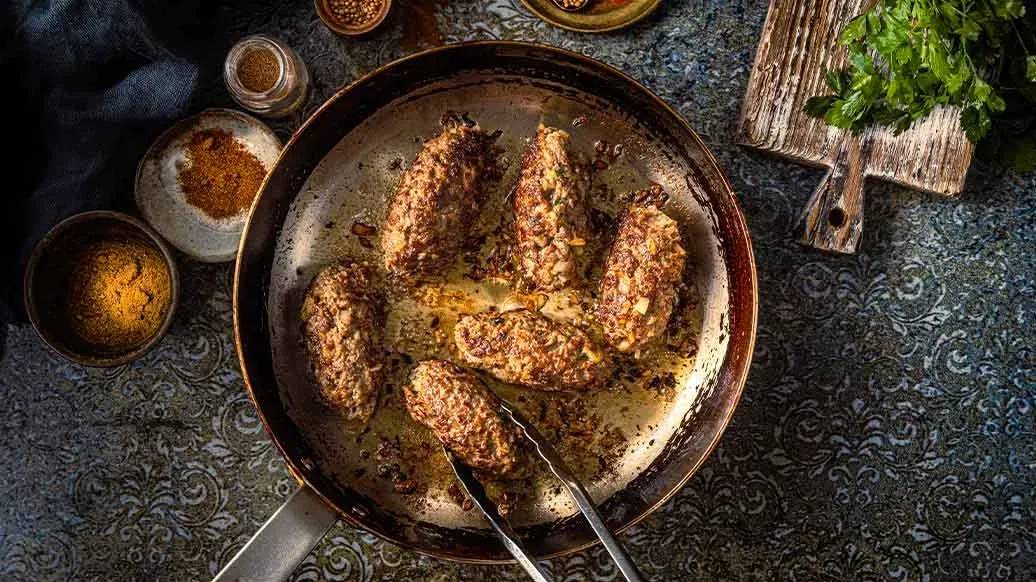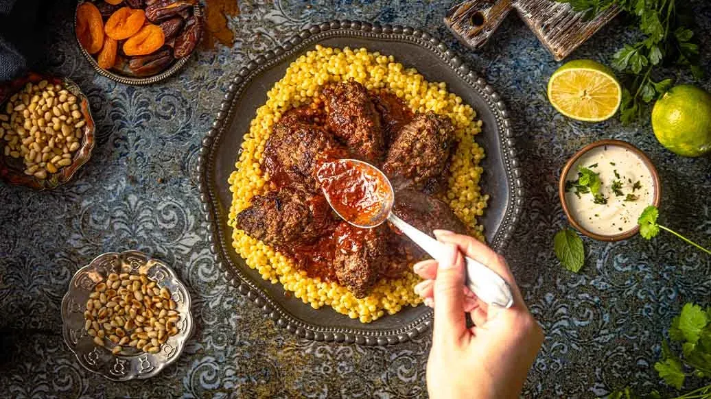 Aromatyczna kofta wołowa doprawiona cynamonem, kminem i świeżymi ziołami, duszona w pikantnym sosie pomidorowym z limonką. Podawana z kuskusem, jogurtem i orzeszkami piniowymi - rozgrzewające danie w bliskowschodnim stylu.