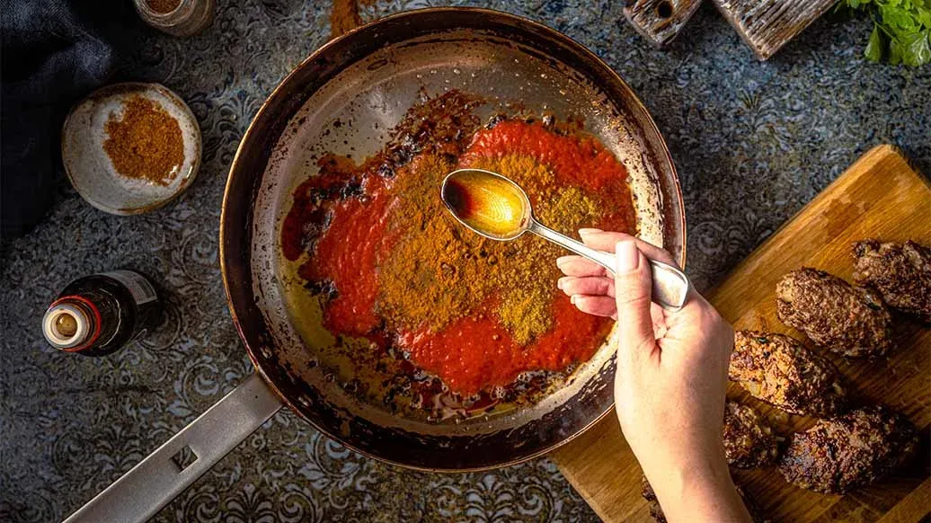 Zdejmij kotlety z patelni. Na patelnię z sosem z gotowania dodaj przecier pomidorowy. Dodaj cynamon, kmin rzymski, chili w proszku i Sos sojowy Kikkoman. Przykryj i gotuj na wolnym ogniu przez około 15 minut.