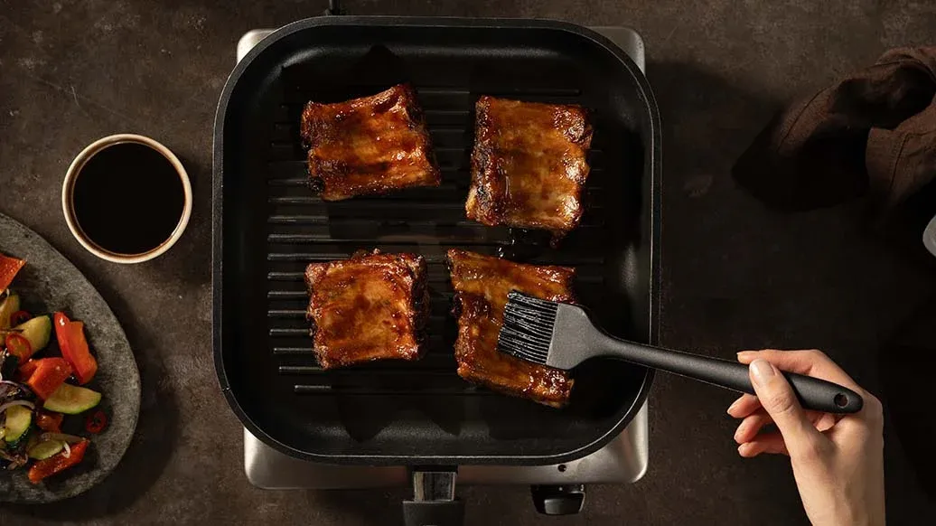 Wyjmij żeberka z piekarnika, pozwól im ocieknąć, a następnie zrumień na bardzo gorącym grillu lub patelni grillowej przez 3 minuty z każdej strony. Wymieszaj zmielone ziarna espresso z 4 łyżkami Sosu Teriyaki z miodem Kikkoman i posmaruj żeberka. Gotowe żeberka podawaj z resztą Sosu Teriyaki z miodem Kikkoman.