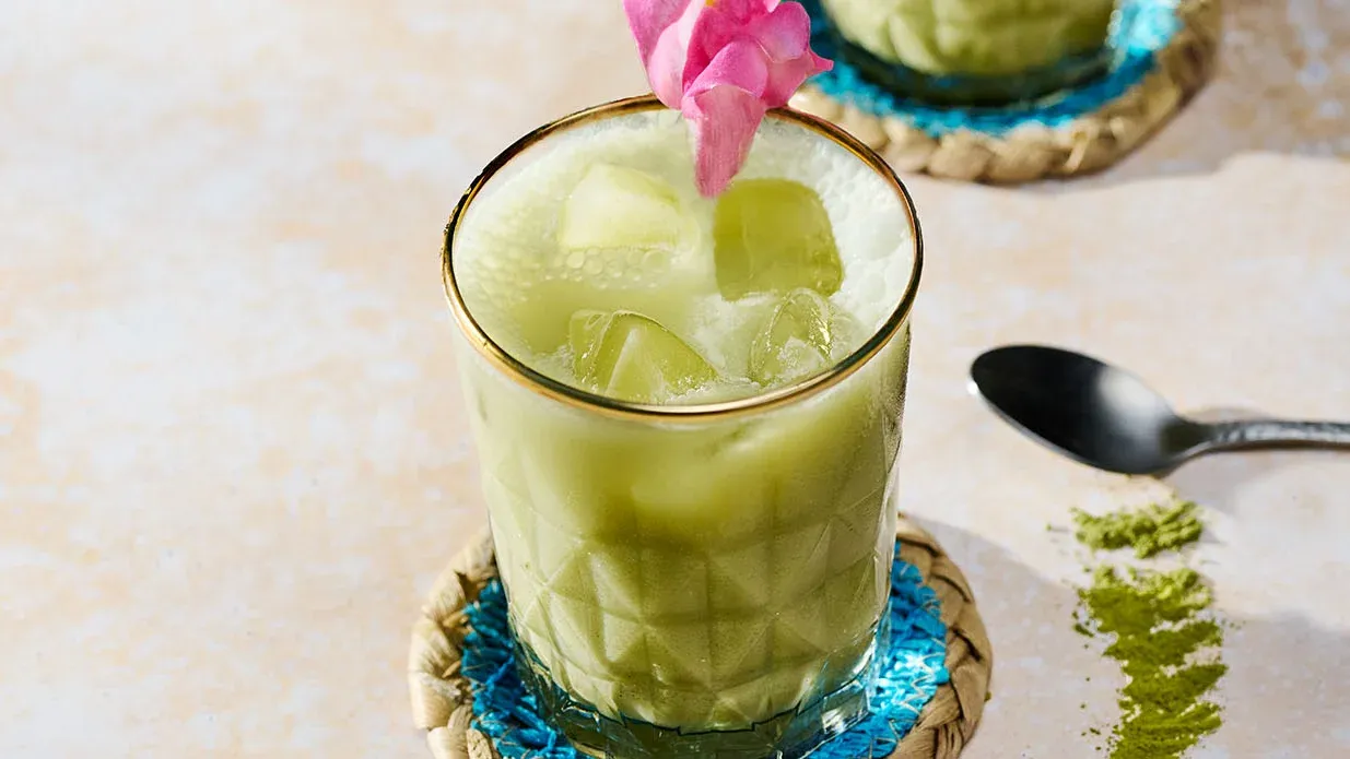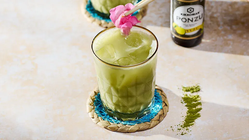 60 g jogurtu greckiego – 4 g proszku matcha – 40 ml soku z yuzu – 2 kilka kropli Kikkoman Ponzu - mieszanka sosu sojowego, octu i soku z owoców yuzu – 60 ml syropu klonowego – 16 kostek lodu (waga kostki lodu około 20 g) – 100 ml wody gazowanej