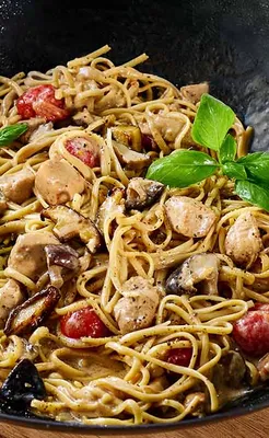 120 g ugotowanego makaronu ryżowego – 20 g ugotowanego groszku – 2 łyżki posiekanych orzeszków ziemnych